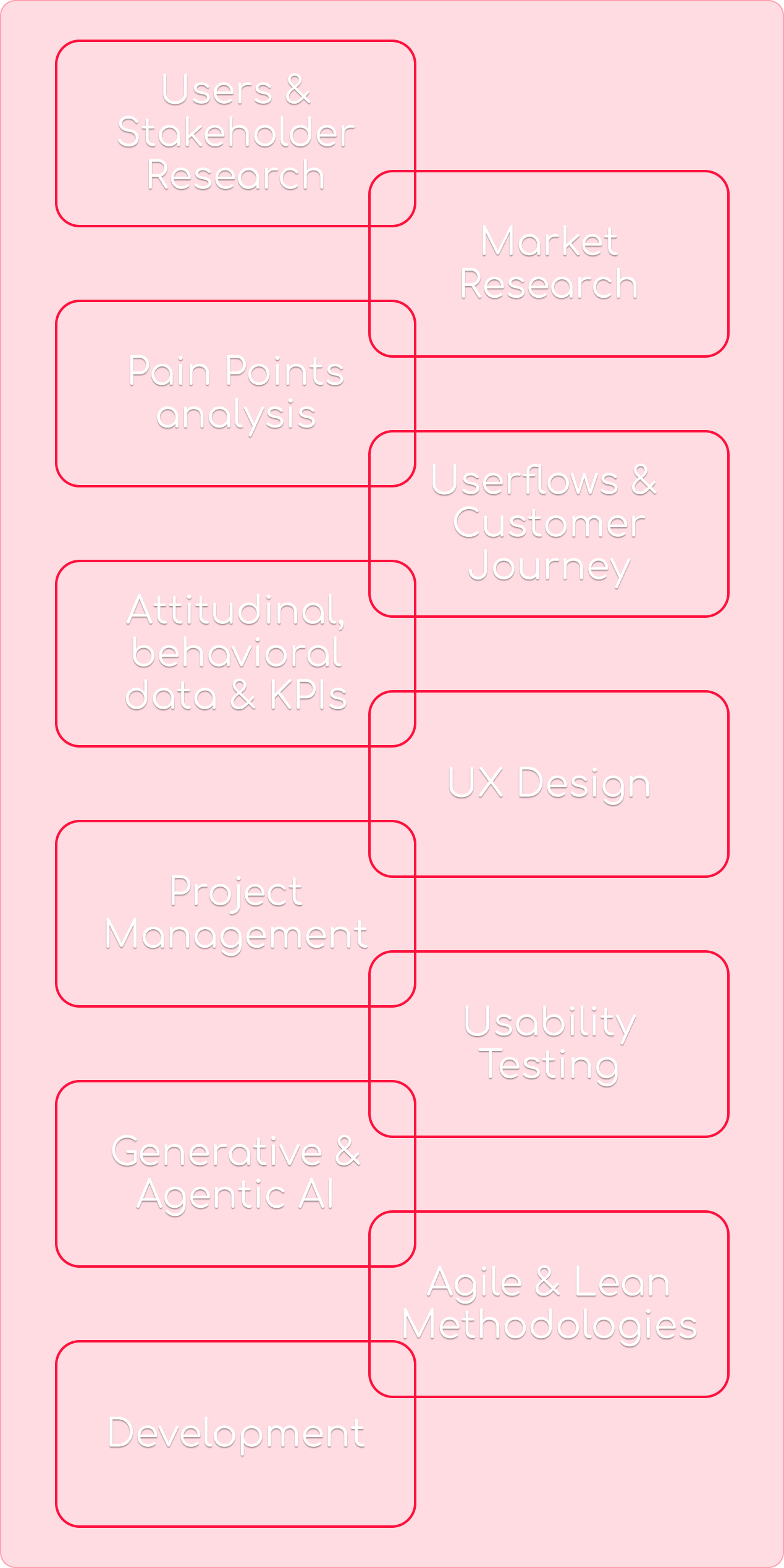 I’m a data-detective. I deduce behaviors through verbal and non-verbal communication that. Having worked with both massive corporations and agencies, I bring a 360-degree market vision to every project. I believe the best products aren’t born from guesswork, but from rigorous, evidence-based strategy and a proper balance between business and user needs.
